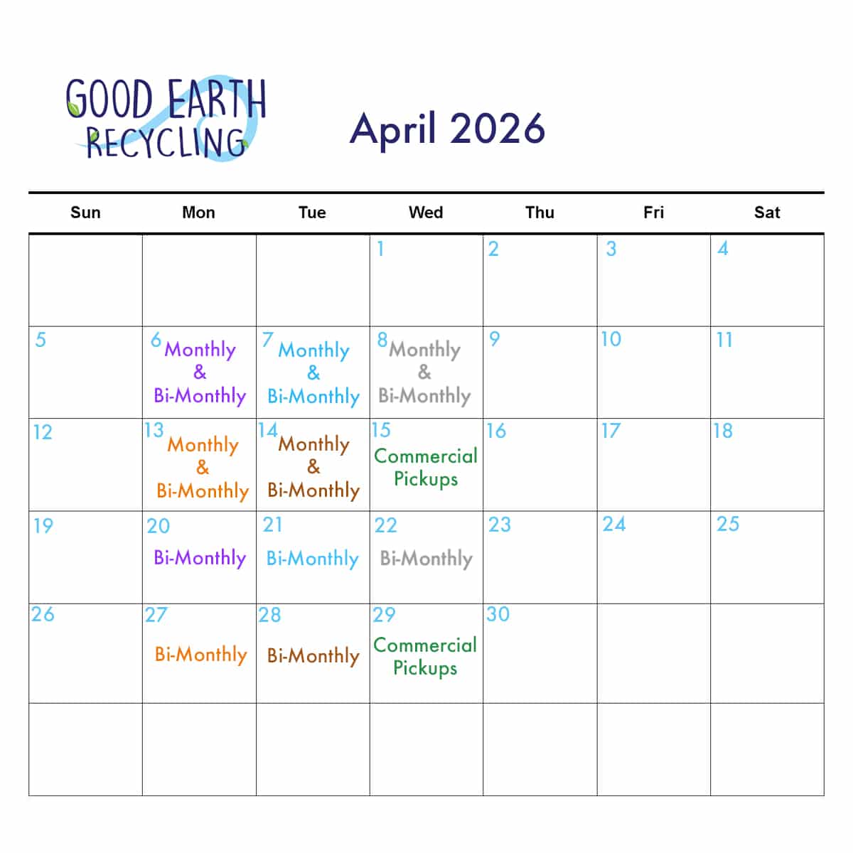 - On the calendar, locate your color to determine the date of your recycling pickups. If your pickup is once per month look for monthly. If your pickup is twice per month look for bi-monthly.